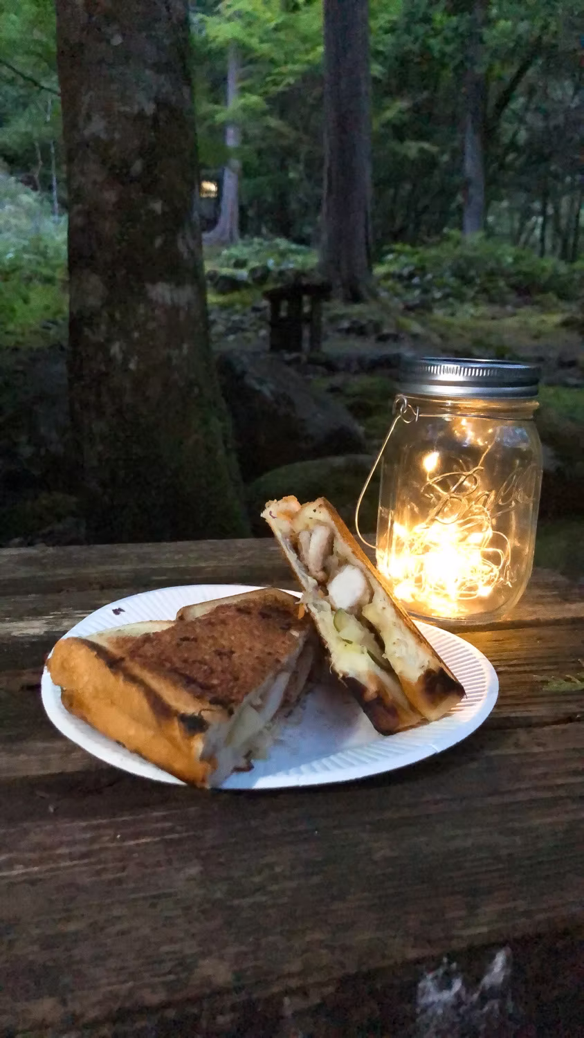 そして、鶏肉もしくは、ベーコンなどを焼き、、、食パンに、野菜と焼いたお肉を乗せ、我が藩特製の梅のソースをたっぷりかけて、サンドして、焚き火の炎で焼き上げるでござる(≧∀≦)
